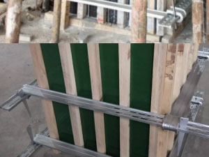 施工流程二另取兩片扣件,彎頭向下,首尾反向,水平放置在方柱另外相對兩側的輔助限位器上(距地面15cm),折彎邊緣與方柱模板外沿對齊,尾端依次穿過折彎處。